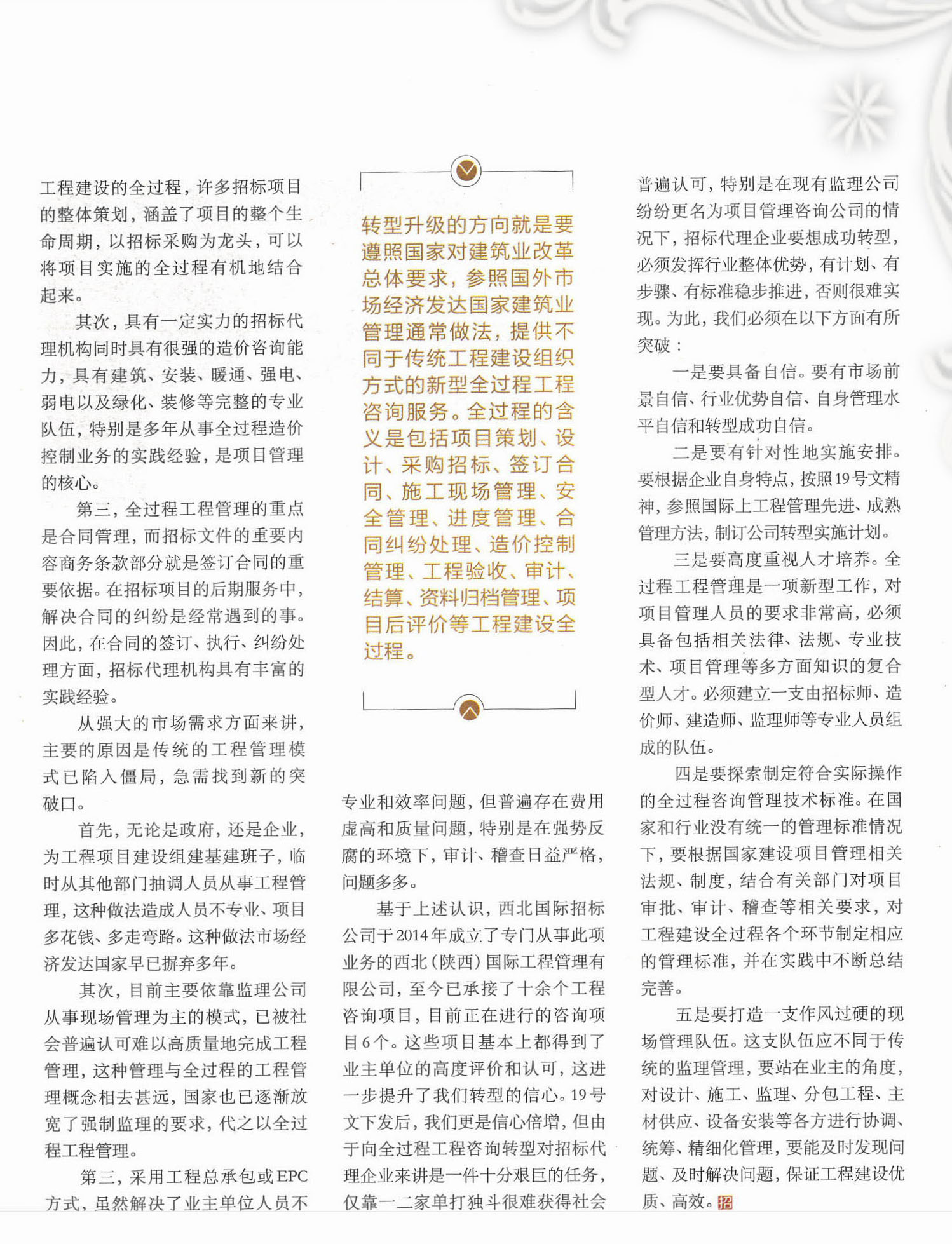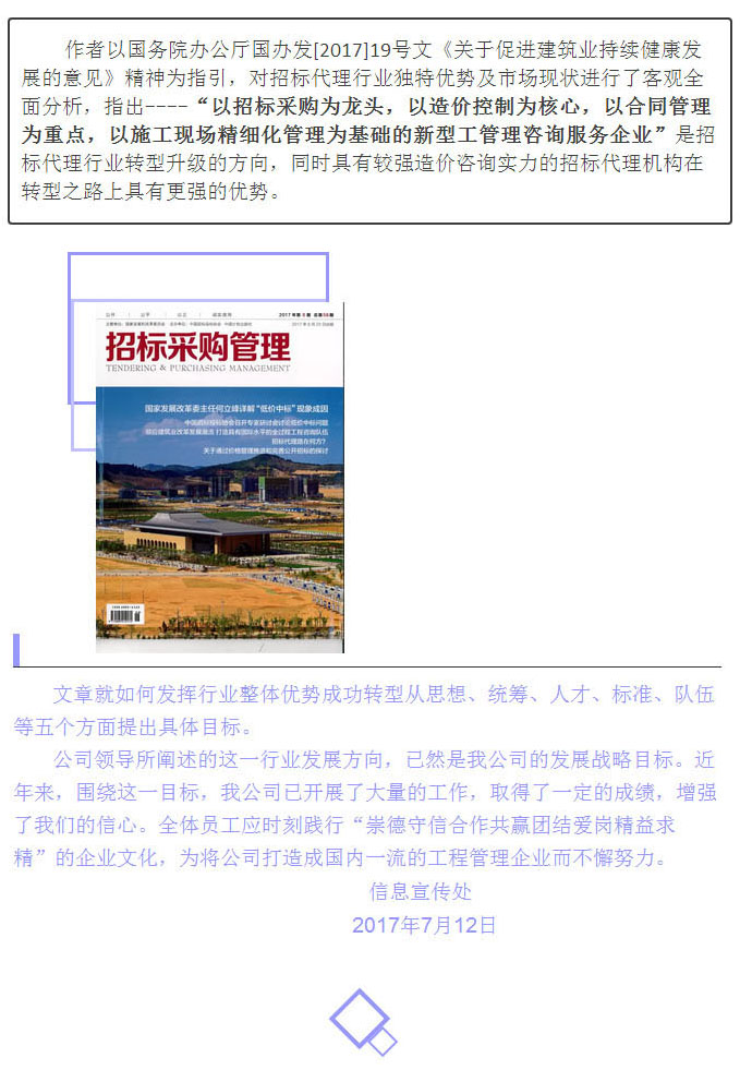 由我公司總經理戈乃西署名的文章《順應建筑業(yè)改革發(fā)展潮流打造具有國際水平的全過程工程咨詢隊伍》,近期在中國招標投標協(xié)會主辦的《招標采購管理》2017年第6期發(fā)表。