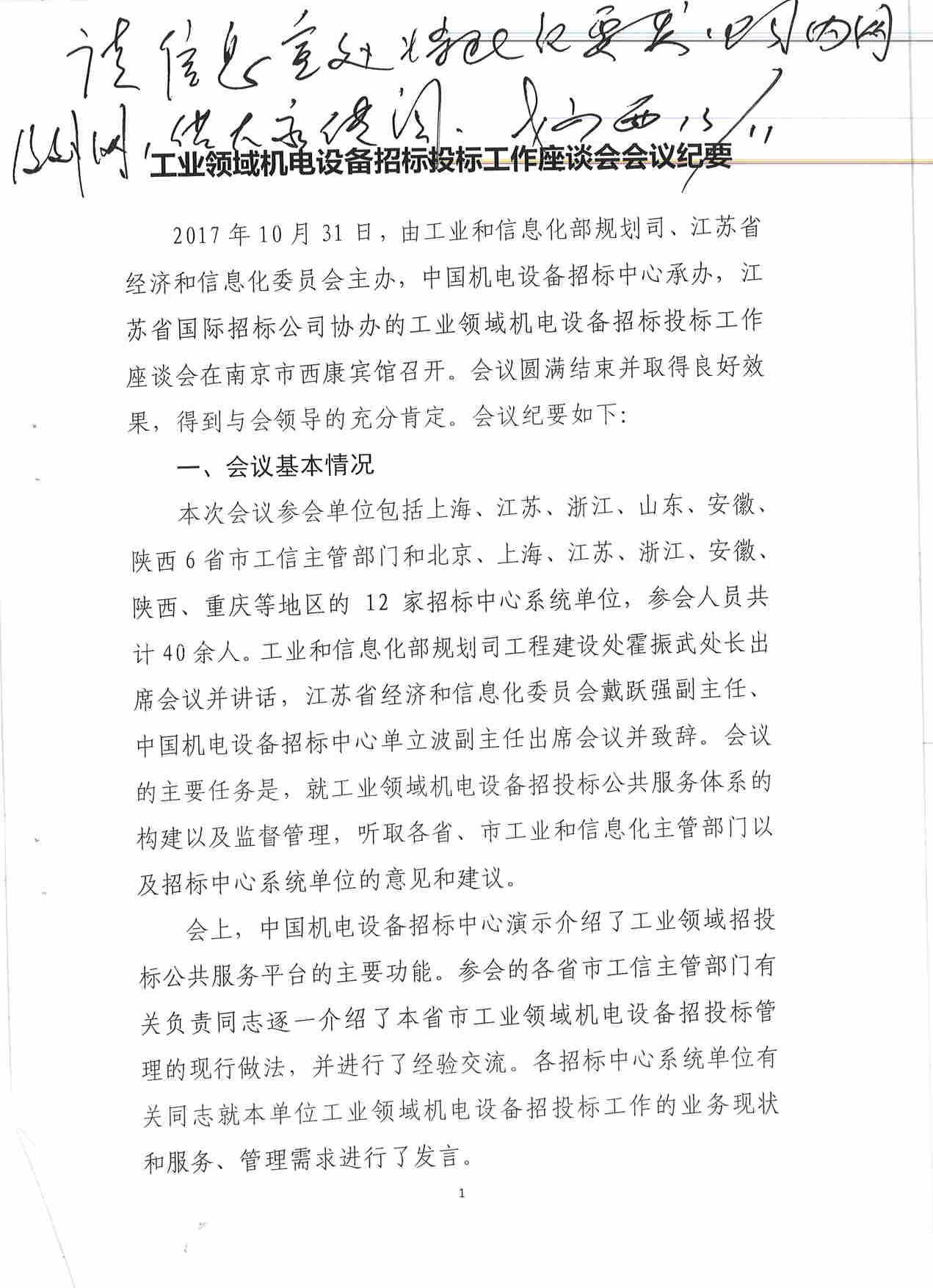 由工信部規(guī)劃司主辦,在南京召開(2017年10月31日)的 “工業(yè)領(lǐng)域機(jī)電設(shè)備招投投標(biāo)工作座談會(huì)”《會(huì)議紀(jì)要》現(xiàn)已下發(fā)。全國6省市工信主管部門和12家招標(biāo)代理機(jī)構(gòu)參加此次座談會(huì),我公司董事長總經(jīng)理戈乃西受邀參加會(huì)議。