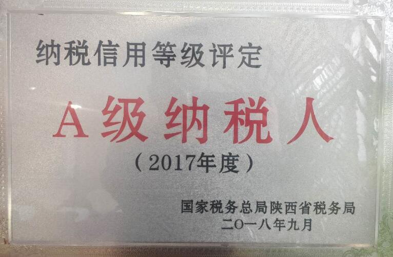 熱烈祝賀我公司榮獲國家稅務(wù)總局陜西省稅務(wù)局評定的“2017年度納稅信用等級評定A級納稅人”!凹{稅信用等級A級納稅人”是國家稅務(wù)總局陜西省稅務(wù)局授予信用良好企業(yè)的最高級別榮譽稱號。