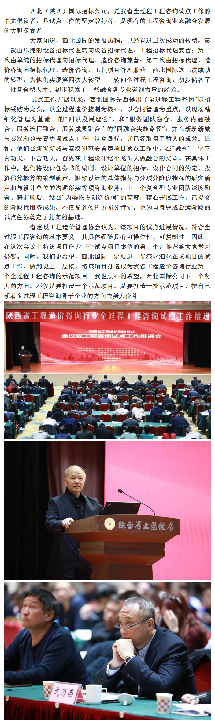 我公司在工程造價咨詢行業(yè)全過程工程咨詢試點工作推進(jìn)會上獲陜西省建設(shè)工程造價咨詢協(xié)會會長彭吉新高度贊揚