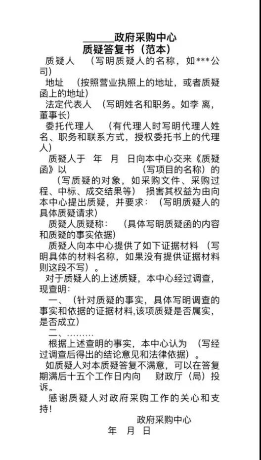 2月1日,財(cái)政部發(fā)布了《政府采購供應(yīng)商質(zhì)疑函范本》和《政府采購供應(yīng)商投訴書范本》,為3月1日即將實(shí)施的《政府采購質(zhì)疑和投訴辦法》(財(cái)政部令第94號令)做好了準(zhǔn)備。以后,全國政府采購項(xiàng)目涉及到供應(yīng)商質(zhì)疑和投訴的均應(yīng)采用這兩個(gè)范本。